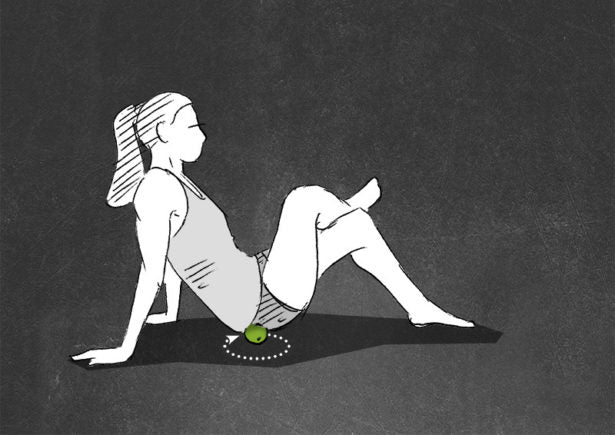 Start in a sitting position with one half of the buttocks on the BLACKROLL® BALL. Put the leg of the same side on top of the other bent leg. Support yourself on your hands.