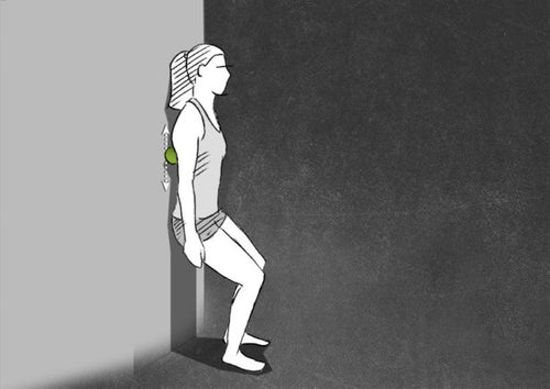 Start in a standing position with the back against a wall. Place the BLACKROLL® BALL between the wall and the back, right next to the spine.