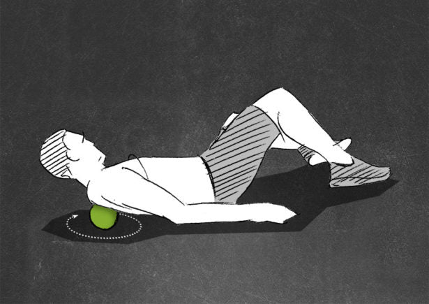 Slowly turn your head to the left and right to massage your neck. Remain on hotspots for about 10s, intensify the pressure with your head against the BALL and perform little noddings. Treat all hotspots of the neck region in this manner.