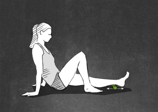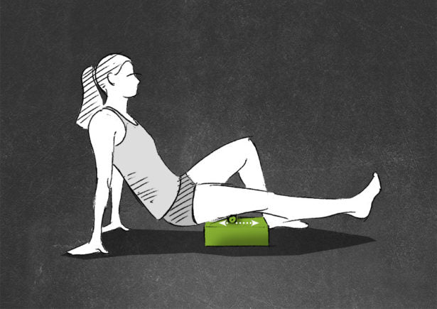 Take your right toes off the floor and rotate the heels outwards. Slowly roll the outer shin between knee and ankle. Then rotate the heels inwards and roll the inner shin. Then switch sides.