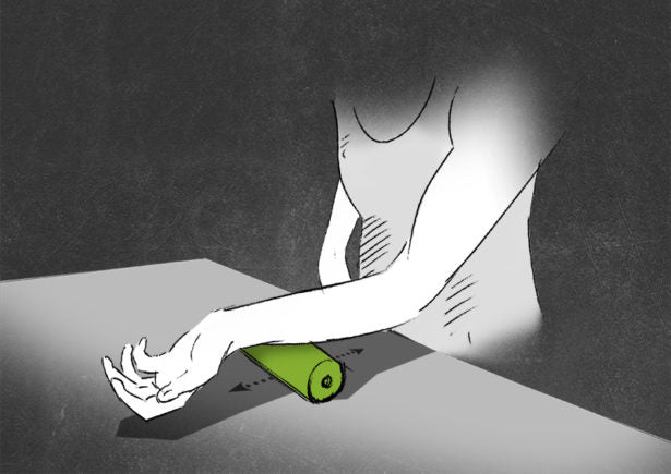 Apply pressure onto the MINI by placing your left hand on the right forearm. Slowly roll back and forth from wrist to ellbow under constant pressure. Turn your right palm downwards and roll the inner forearm. Then switch sides.