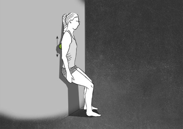 Start in a standing position with the back against a wall. Place the BLACKROLL® MINI between the wall and the back just above your hips.