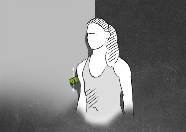Start in a standing position with your right side facing the wall and stretch your right arm upward. Place the BLACKROLL® MINI between the wall and the trunk at the costal arch.
