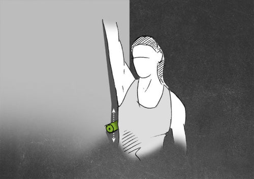Start in a standing position with your right upper arm facing the wall. Place the BLACKROLL® MINI between the wall and the right upper arm.