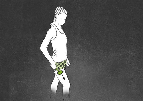 Position the NEEDLEROLLER on the inner thigh, directly on the skin. Roll along the inner thigh up and down. Then roll crosswise to stimulate the upper fascia layer.