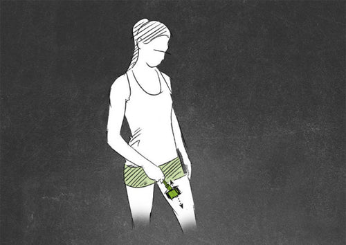 Position the NEEDLEROLLER on the outer thigh, directly on the skin. Roll along the outer thigh up and down. Then roll crosswise, from the quads to the hamstrings to stimulate the upper fascia layer.