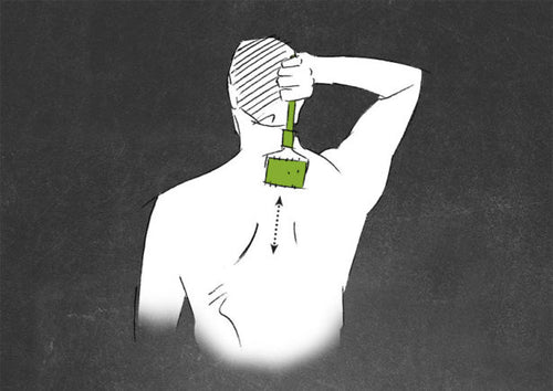 Position the NEEDLEROLLER on the upper back, directly on the skin. Roll along the upper back up and down. Then roll crosswise to stimulate the upper fascia layer.