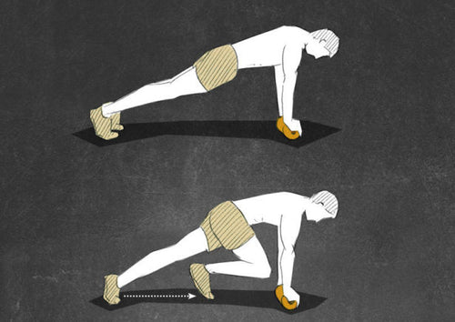 Bring your chest towards the floor and keep your whole body tensioned. Extend your ellbows again and pull your knees towards your chest. Repeat the exercise for 8-10 reps. Make sure that you keep your body tight and your elbows close to your trunk.