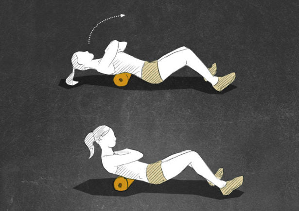 Hyperextend your back as far as possible over the BLACKROLL®. Activate your abs and slowly roll up your core, without losing contact with the BLACKROLL®. Do 15 reps of this exercise.