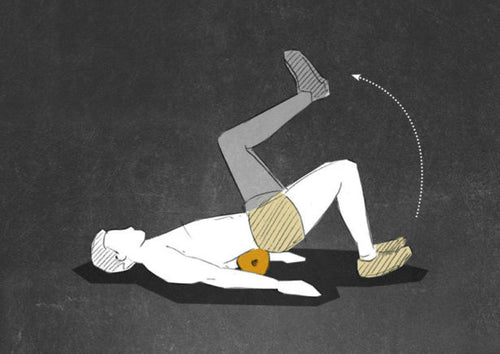 Lie faceup and place the BLACKROLL® just above the pelvis underneath your back. Plant your heels hip-width apart with your feet flexed. Shoulders, head and arms rest on the floor.