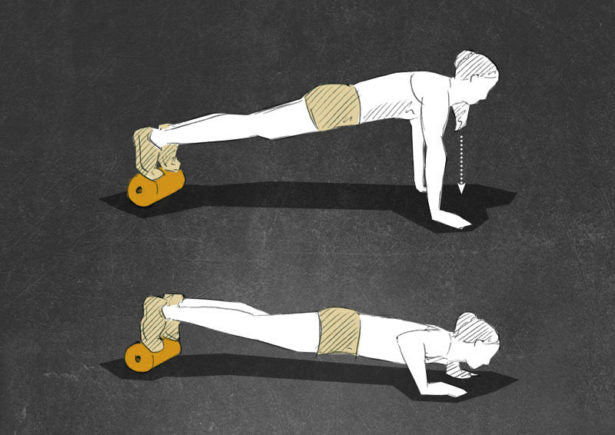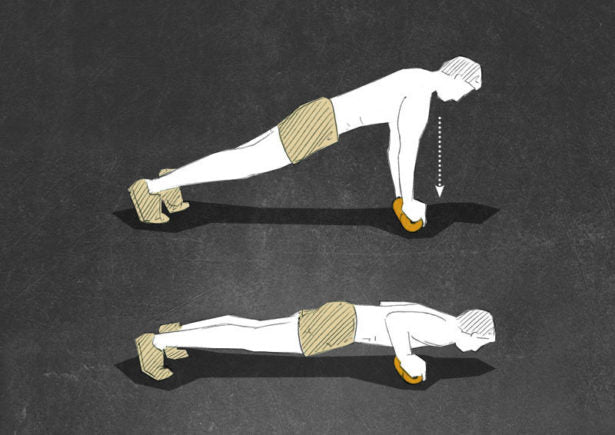 Keep your whole body tensioned and in one straight line. Bend your elbows and bring your chest towards the ground. Extend your ellbows again and repeat the exercise for 10-15 reps. Make sure that you keep your body tight and your elbows close to your trunk.