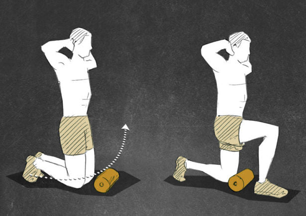 Start kneeling on the floor and place the BLACKROLL® crosswise in front of your knees. Keep your torso upright and lace your fingers behind your head.
