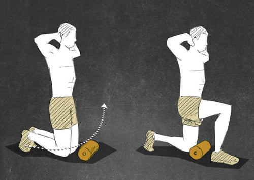 Slowly raise the right knee off the floor and bring it forward over the BLACKROLL®. Make yure to keep your hips tight, not moving laterally or dropping during the movement. Return the right leg over the roller on the floor and start with the left side. Do 10-15 reps of this exercise.