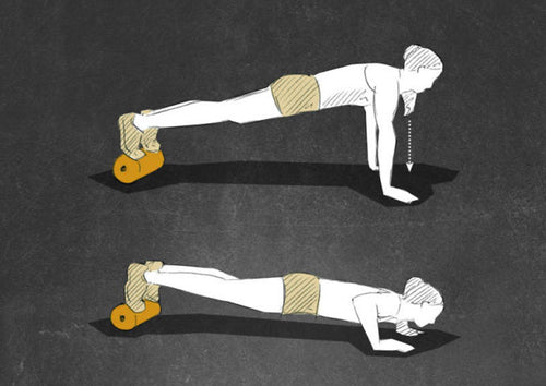 Bring your chest towards the floor and keep your whole body tensioned. Extend your ellbows again and pull your knees towards your chest. Repeat the exercise for 8-10 reps. Make sure that you keep your body tight and your elbows close to your trunk.