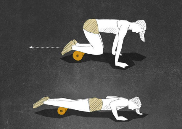 Extend both legs to the back, rolling over the BLACKROLL®. At the same time, bend your elbows.